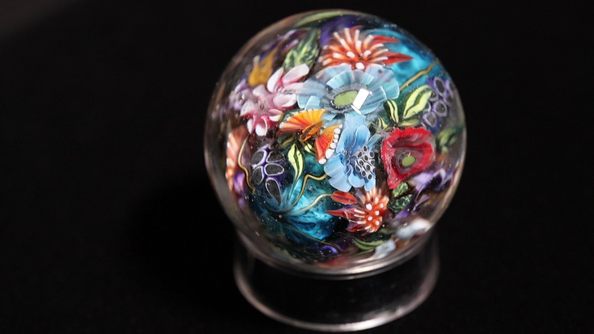 The Object "Blue Mood" is a nocturnal dreamscape encased in glass. The piece is defined by its dramatic background—a swirling, deep-water blue vortex that creates a moody, atmospheric canvas. Against this dark depth, Hernburg has layered a vibrant, almost neon ecosystem. The bouquet features striking azure blooms with crimson centers, offset by splashes of coral orange and verdant green foliage. Fluttering amongst this dense garden are delicate winged figures—butterflies detailed in orange and yellow—that add a sense of fleeting movement to the scene. It is a study in contrast, placing bright, living energy against a backdrop of deep, quiet blue.