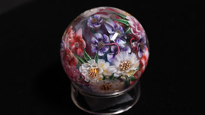 The Object "Silence" is a study in tranquility and composition. In contrast to the chaotic energy of a wild reef, this piece captures the stillness of a quiet garden. The sphere features a lush, suspended bouquet anchored by large, white chrysanthemum-like blooms with golden centers. These primary flowers are surrounded by delicate drifts of violet and periwinkle blossoms, all interconnected by slender green stems. The palette is intentionally soft and muted, allowing the optical clarity of the glass to create a sense of negative space around the flowers. It feels less like an object and more like a frozen moment of calm.