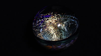 The interior walls of this sphere are densely packed with thousands of microscopic dichroic metallic inclusions. The effect is a "Supernova" of light, a blindingly bright field of gold and bronze sparkles that radiate from the center vortex. Unlike his smoother, scale-patterned works, this piece relies on a high-density stippling technique that causes the marble to "ignite" when hit with direct light.