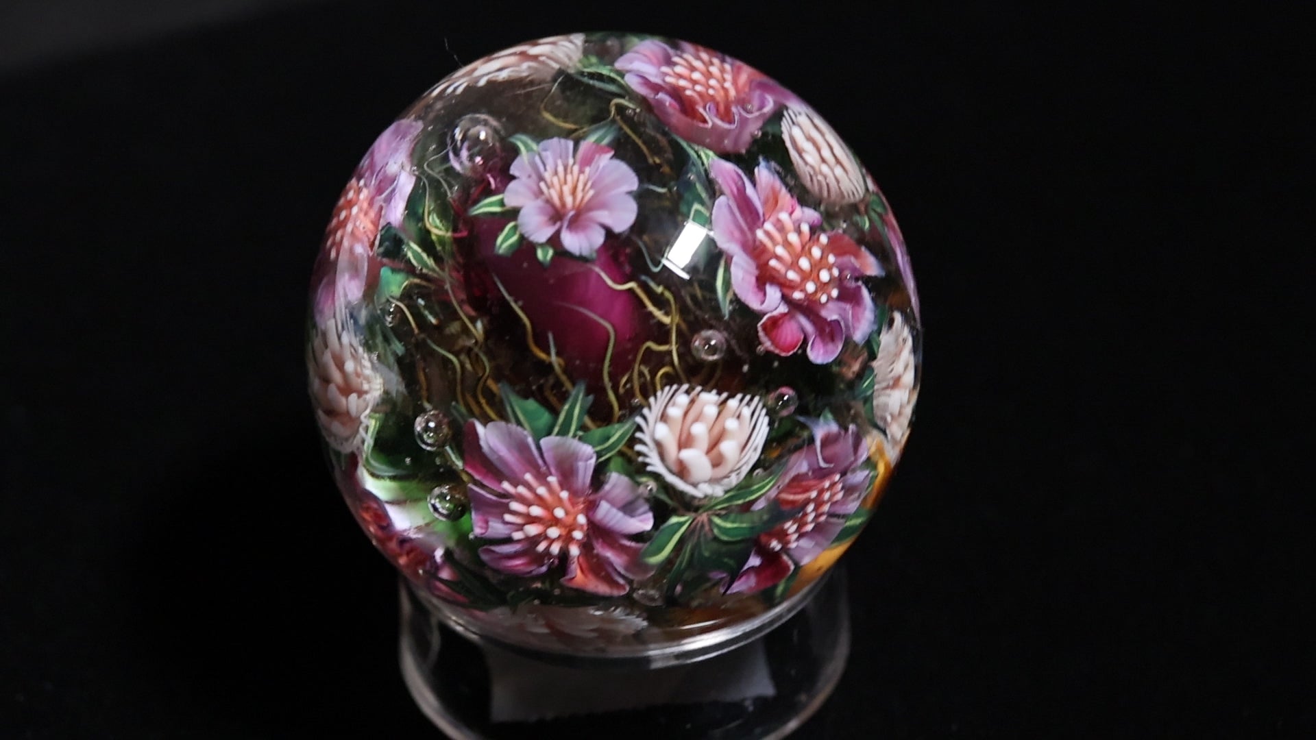The Object "Wild Bloom" acts as a miniature terrarium, capturing the chaotic beauty of an overgrown meadow. Unlike single-subject floral marbles, this piece presents a complete botanical scene rooted in a deep, rich plum-colored ground. Rising from this dark base is a dense, multi-species bouquet: vibrant purple asters with bright yellow centers crowd against textured clusters of white, thistle-like blooms. The floral arrangement is interwoven with verdant green stems and foliage, creating a sense of movement and life. Hernburg’s signature "soft" glass technique gives the scene a painterly quality, as if an Impressionist still life has been suspended in three dimensions.